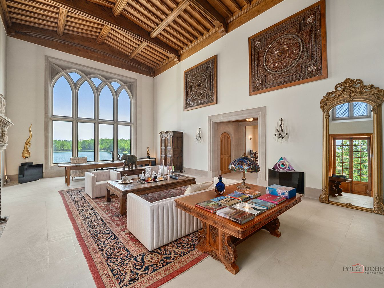 A grand living room with soaring wooden-beamed ceilings and stunning arched windows offers sweeping water views, filling the space with natural light. Neutral cream floors and walls create a serene canvas while intricate wall art, ornate carved tables, and a deep red Persian-style rug lend warmth and sophistication. Plush, modern white sofas are arranged for easy conversation, making this space inviting for both family gatherings and entertaining guests. Decorative golden sculptures and a vintage Tiffany-style lamp provide artistic flair. A large, gold-framed mirror brightens the space, enhancing its open, elegant feel. The room blends classic grandeur with family-friendly comfort.