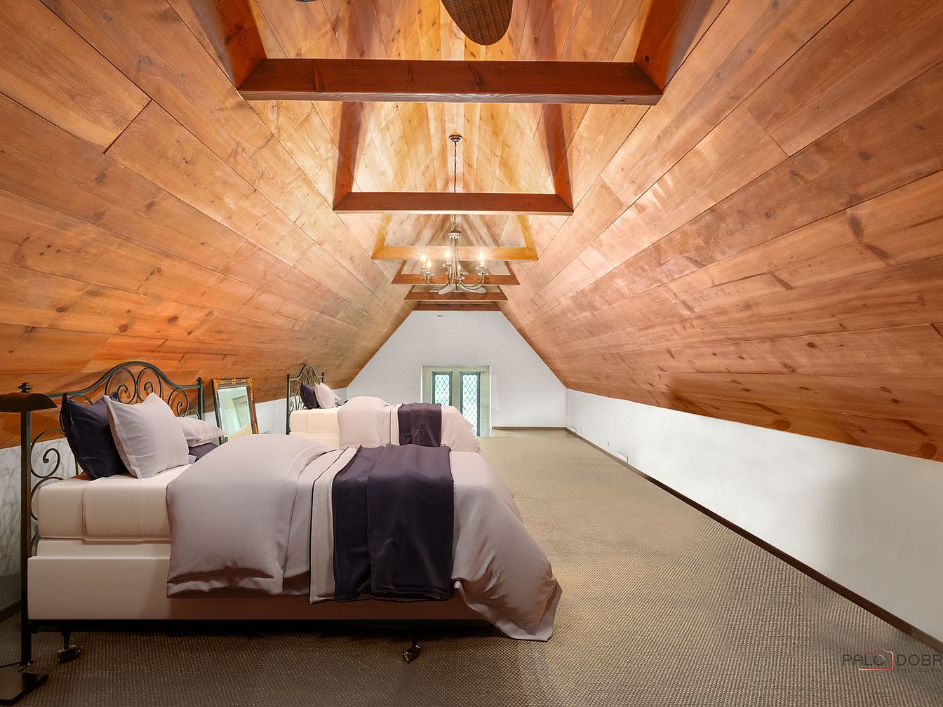 A spacious attic bedroom creates a cozy yet open atmosphere with its sloped wooden plank ceiling and exposed beams, lending rustic charm and warmth to the space. Large twin beds with ornate metal frames and plush bedding make this room perfect for siblings or sleepovers, combining comfort with elegance. Natural light streams in through a charming end window, brightening the neutral carpeted floor and making the area inviting for families. The expansive layout offers plenty of space for relaxation or play, while the minimal decor keeps the environment serene and uncluttered, ideal for both children and guests.