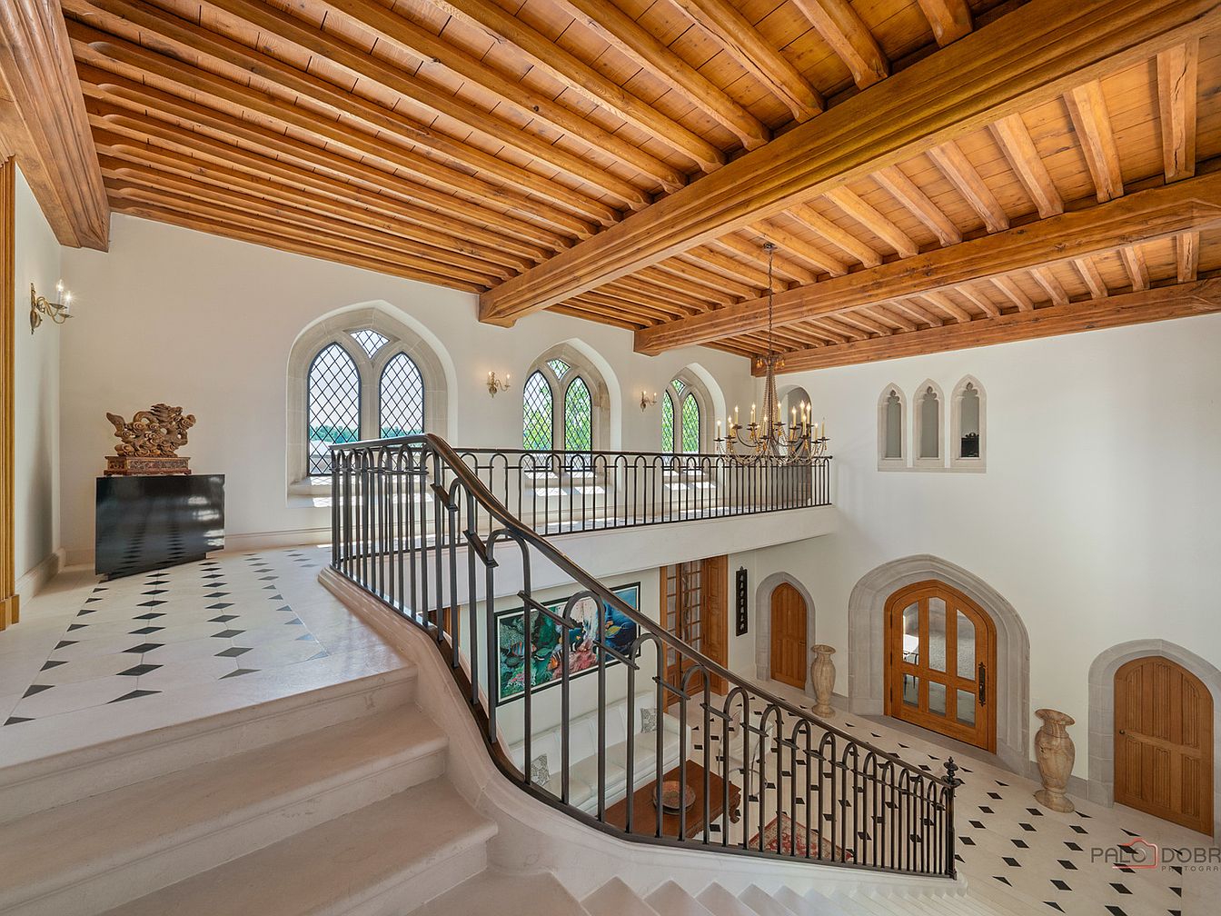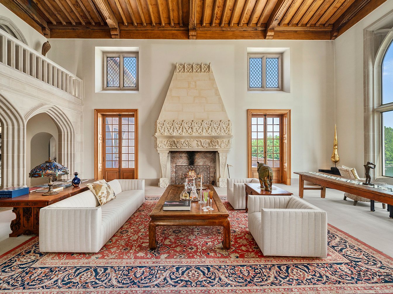 A grand living room with soaring wooden ceilings and intricate architectural details creates a welcoming space for gatherings. The focal point is a stone-carved fireplace with an ornate mantel, flanked by tall windows that invite natural light. Creamy walls contrast beautifully with rich wood beams and elegant archways, adding a touch of old-world charm. Plush, modern white sofas and a large wooden coffee table rest atop a vibrant Persian rug, balancing classic and contemporary aesthetics. Family-friendly features include ample seating, a spacious layout for play or relaxation, and thoughtfully arranged tables for both leisure and social activities.