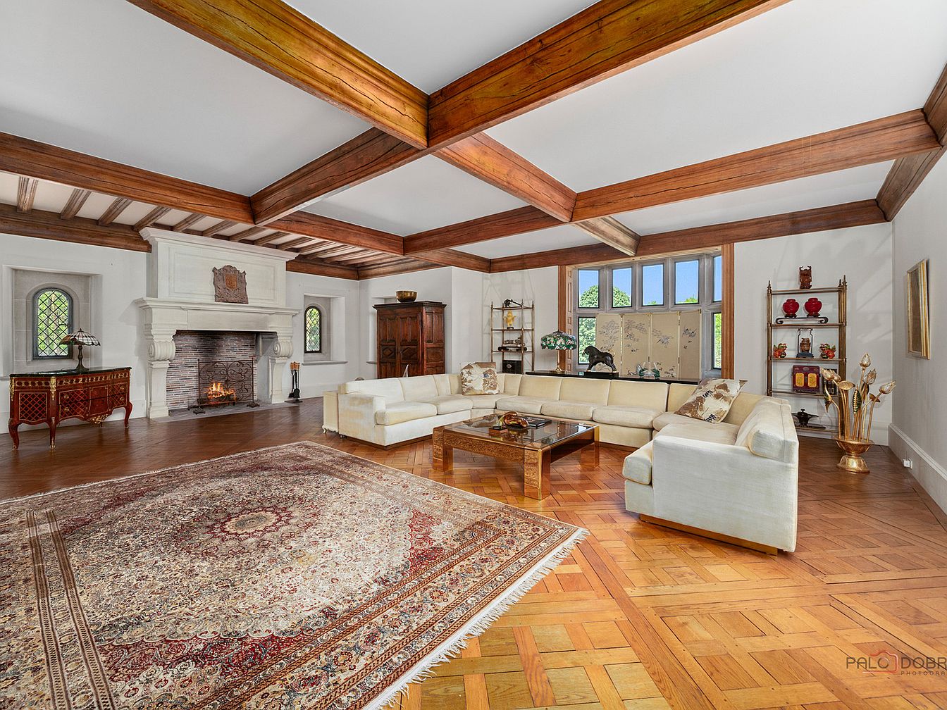 A spacious living room featuring a harmonious blend of traditional charm and modern comfort. Wood beams stretch across the ceiling, adding architectural character and warmth, while natural light pours in through leaded-glass windows. The large sectional sofa provides ample seating, ideal for family gatherings and relaxing evenings by the elegant white stone fireplace. Rich parquet wood flooring enhances the classic ambiance, complemented by a luxurious Persian rug at the room’s center. Decorative shelves and accent furnishings display curated art pieces, infusing personality. Thoughtful design ensures the space is both inviting and practical for family-friendly living and entertaining.