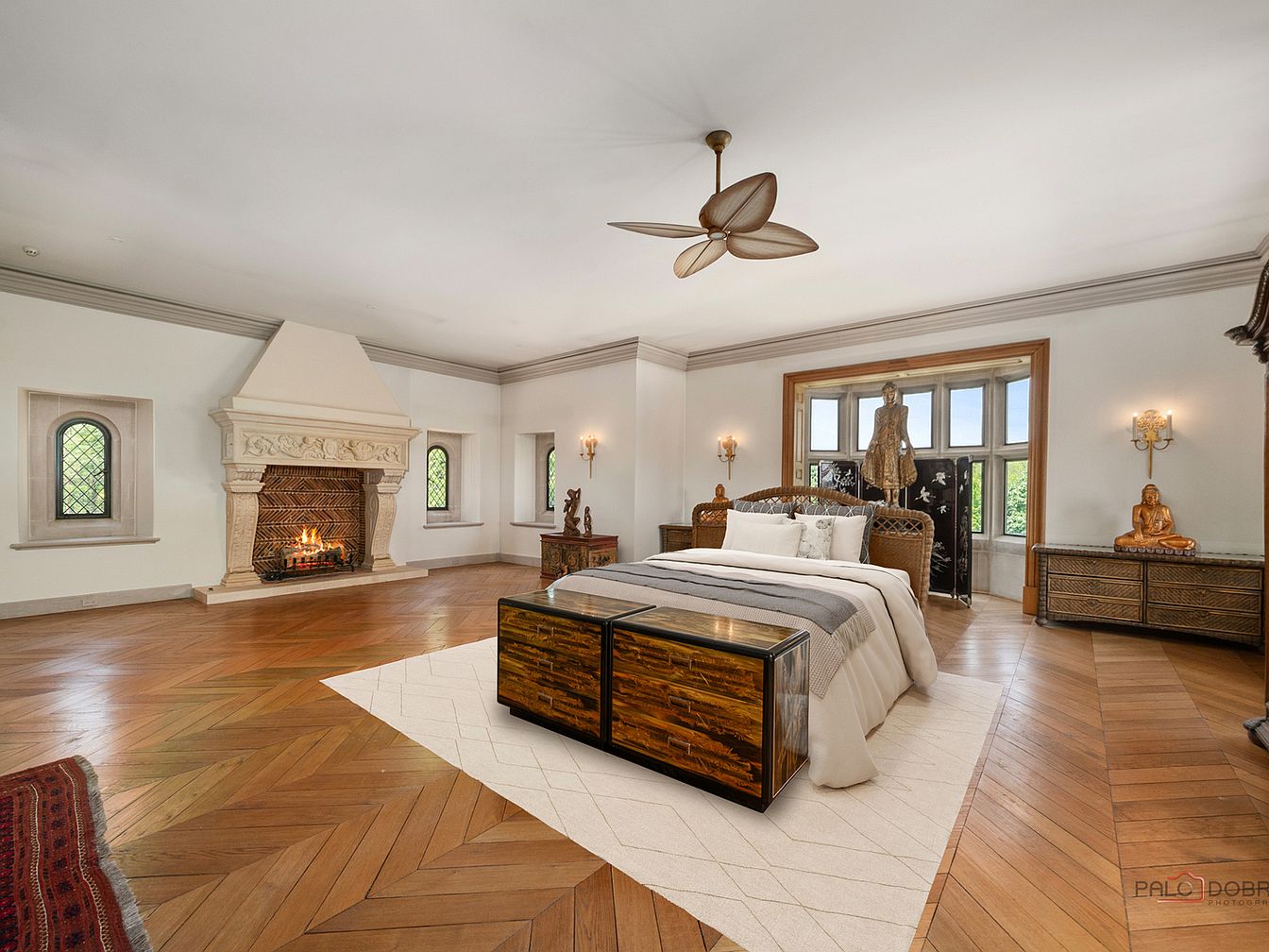 Spacious master bedroom featuring warm, herringbone hardwood floors and a grand stone fireplace that instantly adds coziness and character. Charming, tall windows with diamond-pane glass let in natural light while maintaining privacy, making the space bright yet intimate. The room hosts a large, inviting bed framed with intricately woven wood, flanked by elegant nightstands and relaxing armchairs for comfort and reading. Decorative statues and textured accent pieces infuse a tranquil, sophisticated vibe. Muted cream walls and subtle grey trim blend beautifully with the wood tones, creating a serene, family-friendly retreat ideal for relaxation and unwinding at the end of the day.