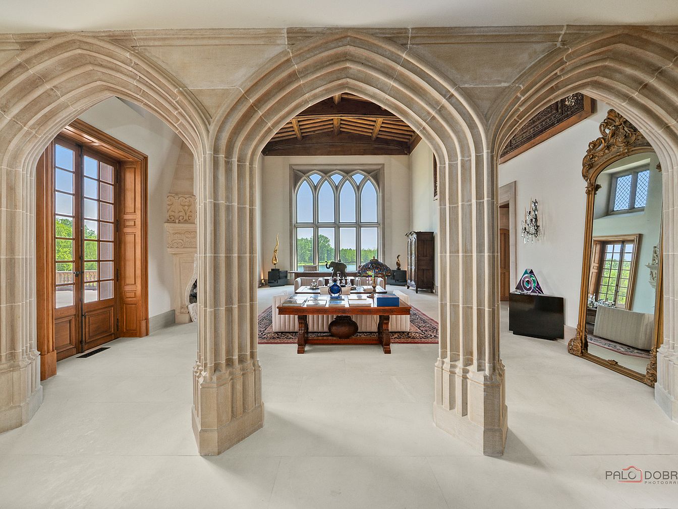 A breathtaking entryway leads into an expansive living room framed by soaring stone arches that echo classic Gothic architecture. The space is illuminated by abundant natural light streaming through oversized, cathedral-style windows that overlook lush greenery. Elegant wooden accents, including French doors and ceiling beams, warm up the neutral palette, while a large decorative mirror reflects both light and sophistication. The living area features plush, inviting seating clustered around a traditional wooden coffee table atop an ornate area rug, providing a comfortable, family-friendly space for gathering. Carefully chosen art pieces and sculptural lighting add personality without overwhelming the serene ambiance.