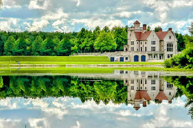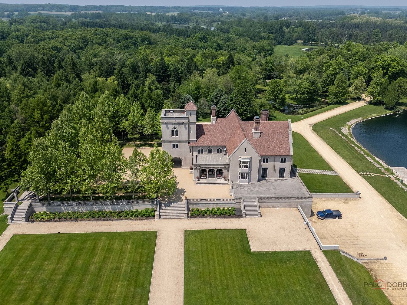 An impressive lakeside home showcases grand architecture with castle-like features, including a prominent tower and steep-pitched red roofs contrasted against creamy stone walls. Expansive lawns stretch to the water’s edge, creating an inviting play area for families and offering plenty of space for outdoor gatherings. The large arched windows and doors allow for ample natural light and beautiful views of the serene lake, perfectly mirroring the house and surrounding greenery. Mature trees form a lush backdrop, enhancing privacy and tranquility. The house’s striking proportions and scenic placement make it ideal for those seeking both elegance and family-friendly outdoor living.