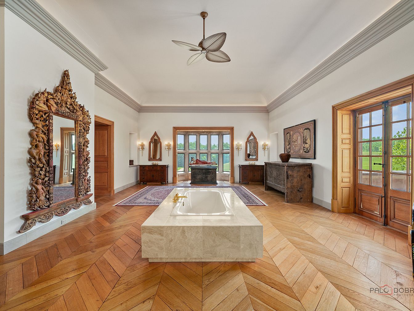This spacious bathroom features an elegant, centrally placed soaking tub set atop a pristine marble platform, perfect for family relaxation and unwinding. Natural light streams through large, wooden-framed French doors and windows, offering serene garden views that complement the airy feel. The herringbone wood flooring adds warmth and character, while the intricate carved wood mirror and antique chests bring timeless charm. Soft neutral walls and classic trim enhance the sophistication. With ample floor space for moving around, a plush area rug, and generous cabinetry for storage, the design is both inviting and functional, welcoming families of all sizes.