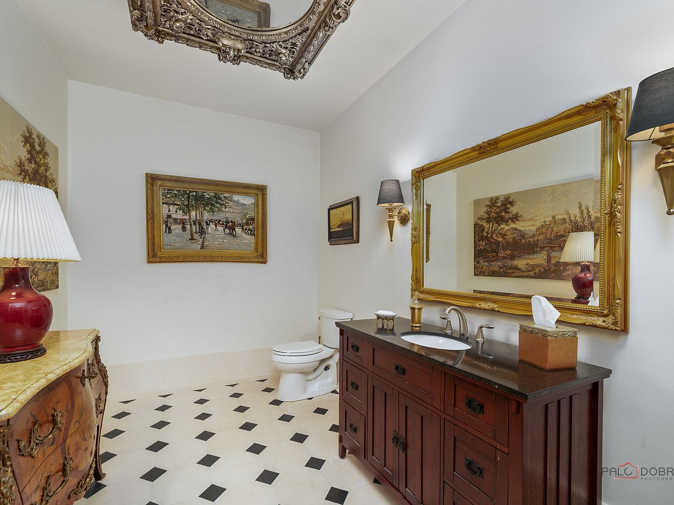 This bathroom features a sophisticated blend of classic and contemporary design elements for a welcoming and upscale feel. The spacious layout includes a rich wooden vanity with ample storage, topped with a sleek countertop and accented by a grand, gilded mirror that adds a touch of opulence. The black-and-white patterned floor tiles give the space character, while the gold-trimmed artwork and ornate ceiling mirror provide additional visual interest. Decorative table lamps and matching wall sconces create a warm, family-friendly ambiance. Neutral wall colors ensure a bright, airy atmosphere, making it ideal for both adults and children.