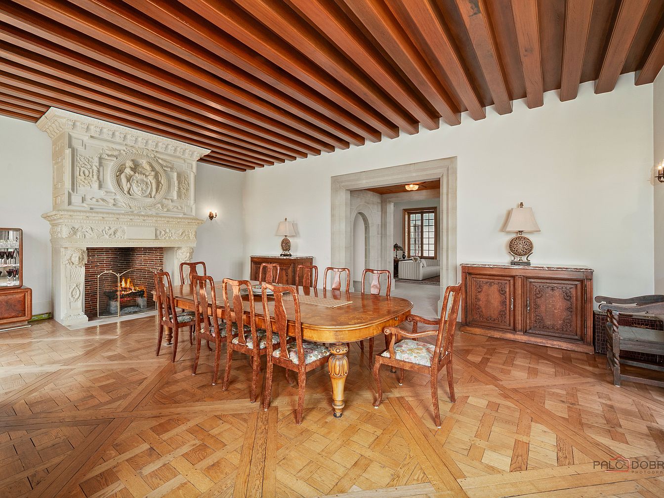 A grand dining room features a stunning carved stone fireplace as its focal point, enhancing the sense of warmth and elegance. The space is anchored by a large wooden dining table surrounded by matching chairs, perfect for family gatherings or entertaining guests. Beautiful parquet wood flooring and exposed wooden ceiling beams add a sophisticated, historic charm. The neutral walls and natural wood tones create a welcoming, balanced color palette, while the addition of ornate wooden sideboards and vintage lamps offers convenient storage and soft lighting, making this an ideal space for both everyday meals and special occasions.