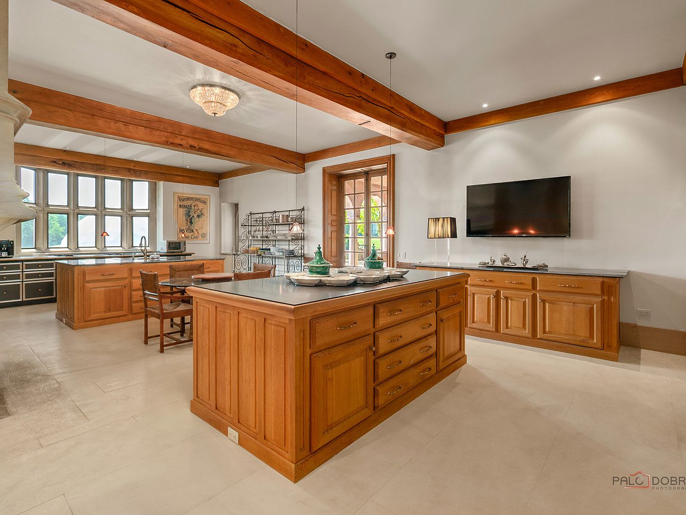 A spacious and inviting kitchen features warm wooden cabinetry with a large central island ideal for meal prep or family gatherings. Exposed wood ceiling beams lend a rustic charm, complemented by cream-colored tile flooring that keeps the space bright and airy. Ample counter space, along with a cozy dining nook, makes this kitchen suitable for busy mornings or entertaining guests. Modern touches include a mounted TV, recessed lighting, and a sleek chandelier. The layout ensures convenient flow for families, while expansive windows provide natural light and beautiful outdoor views, creating a practical yet welcoming heart of the home.