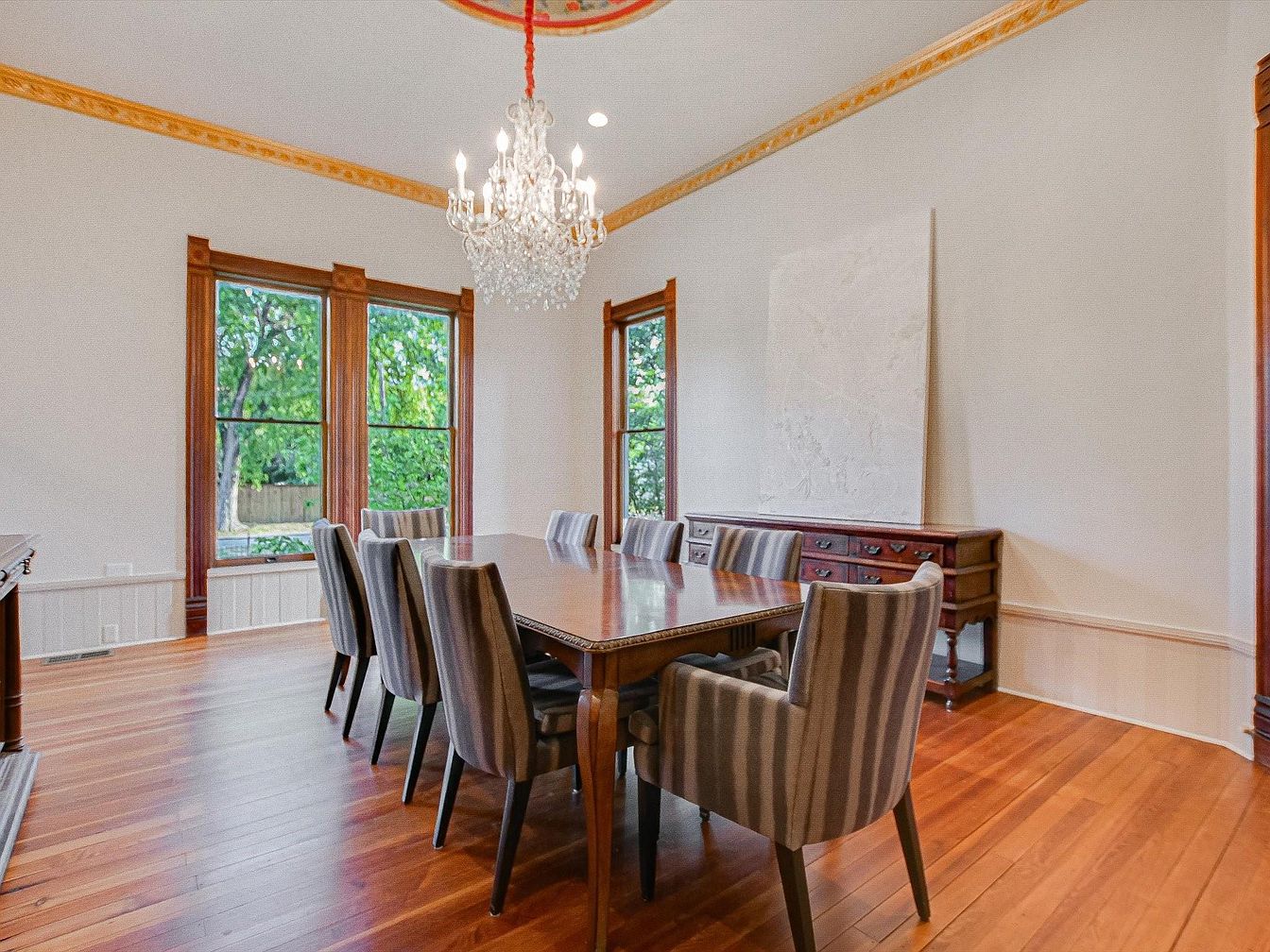 A spacious dining room bathed in natural light from large, wood-framed windows, offering views of the green backyard. The layout centers around a long wooden dining table surrounded by cushioned, striped chairs, making it comfortable and practical for family dinners or gatherings. The room’s high ceiling features a sparkling crystal chandelier and decorative crown molding painted gold, adding a touch of classic sophistication. Warm hardwood floors enhance the cozy, inviting atmosphere, while a wooden sideboard and minimalist wall art provide both elegance and functionality. This space is ideal for family meals, celebrations, or entertaining guests in a refined setting.