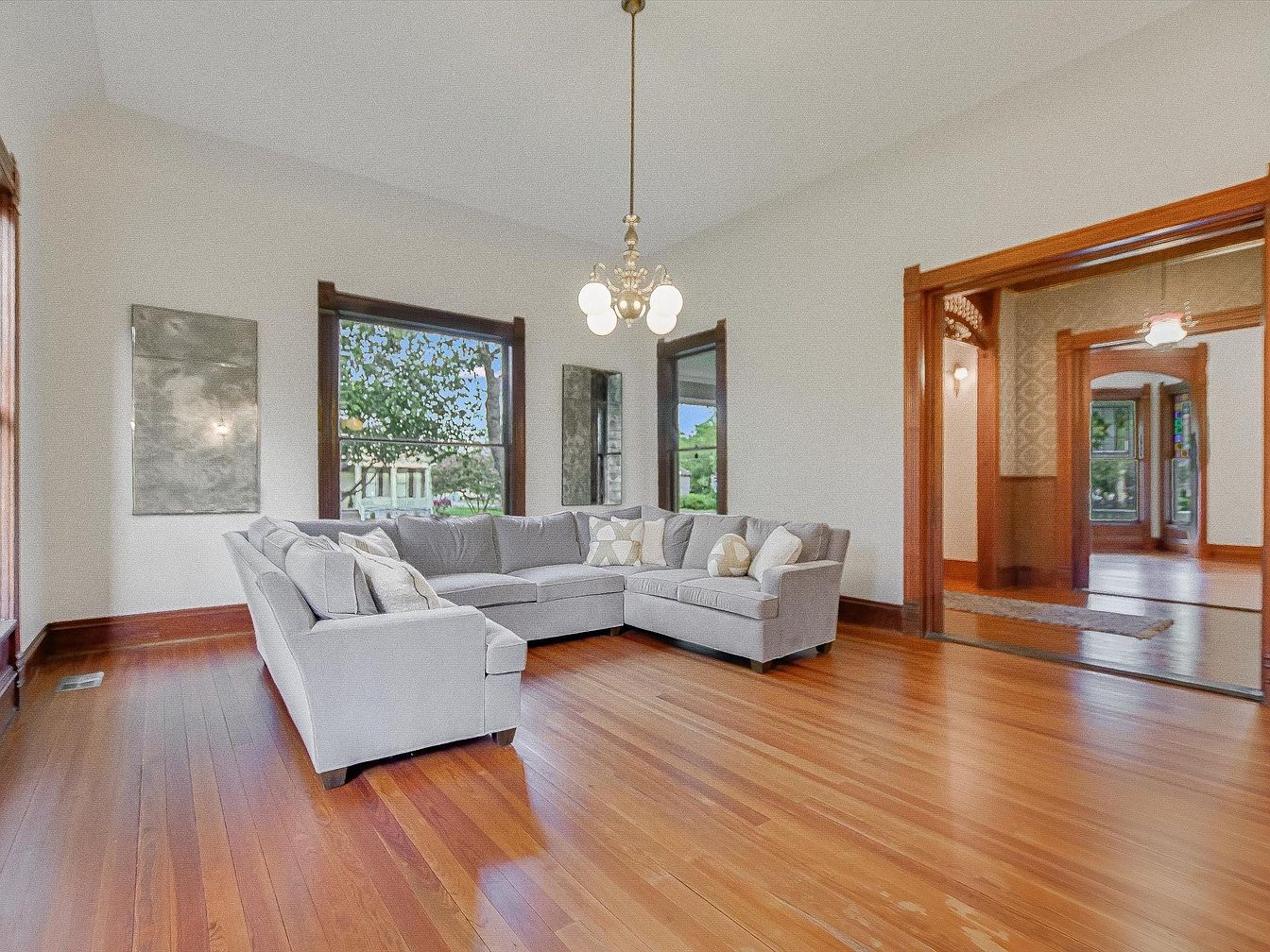 Spacious and inviting, this living room features warm hardwood floors, tall ceilings, and abundant natural light pouring through large windows bordered by rich wood frames. A cozy L-shaped sectional sofa with plush, neutral-toned cushions creates a comfortable area for family gatherings and relaxation. Soft white walls enhance the open feel, while tasteful artwork adds a touch of contemporary style. Architectural details such as elegant wood trim and wide doorways seamlessly connect this area to the adjacent rooms, making it ideal for both entertaining and everyday living. The overall atmosphere combines timeless charm with a welcoming, family-friendly environment.