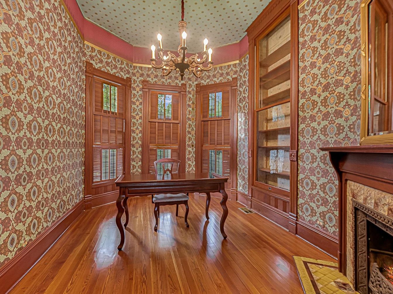 This formal dining room exudes classic American charm with ornate patterned wallpaper in warm tones, contrasted beautifully with polished hardwood floors and rich wood trim. Large bay windows with intricate woodwork shutters allow plenty of natural light, creating a welcoming space for family gatherings. The elegant chandelier and high, patterned ceiling provide a touch of vintage sophistication. Built-in shelving and a detailed fireplace frame the room, both practical for storage and decorative displays. The layout maximizes space for a central dining table, ensuring ample room for social interaction, dinners, and entertaining in a timelessly stylish setting.