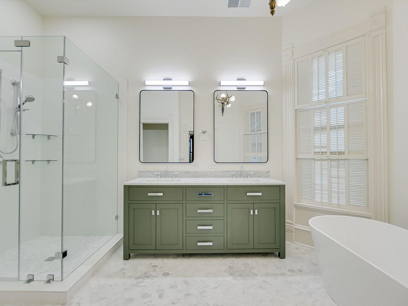 A bright and spacious bathroom features a large double vanity with a soft green finish, topped by a marble countertop that offers generous space for essentials. Two sleek, modern mirrors paired with contemporary wall sconces make the area well-lit and practical for daily use. The walk-in glass shower with chrome fixtures and built-in shelving enhances functionality, while the freestanding soaking tub creates a spa-like atmosphere. Large windows with classic trim and privacy blinds allow natural light to fill the room. The neutral color palette, marble-patterned floor, and uncluttered layout make this an inviting, family-friendly retreat for all ages.