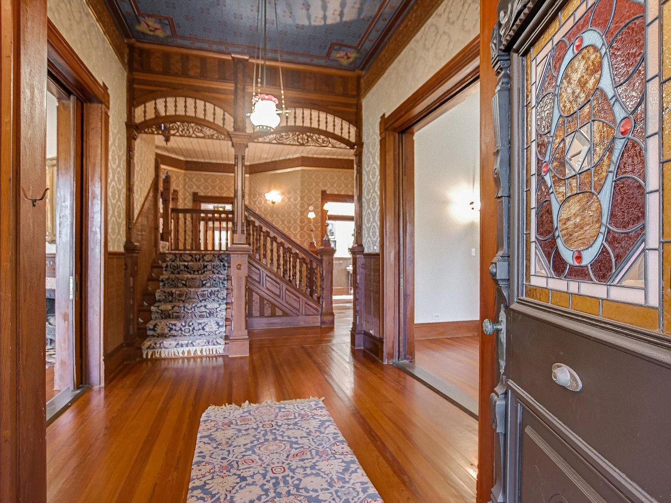 Step into a spacious entryway adorned with classic woodwork and an intricately patterned staircase, offering a warm and inviting welcome. The rich hardwood floors and ornate stained-glass door set an elegant tone, while the decorative ceiling and vintage wallpaper add historic character. Arched woodwork and columns frame the view into adjoining rooms, guiding guests through the open layout. The plush runner on the stairs and the detailed area rug ensure comfort and safety, making this entry both beautiful and family-friendly. Ample natural light and softly glowing fixtures create a cozy ambiance perfect for gatherings and daily family life.