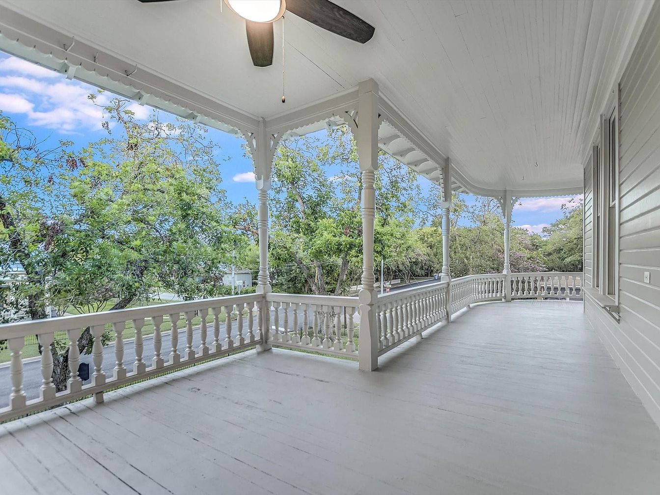 This charming wraparound porch offers a spacious and inviting outdoor living area, ideal for relaxing evenings or family gatherings. The porch features classic white woodwork with ornate spindle railings and decorative trim, evoking a timeless Victorian aesthetic. Its generous layout easily accommodates rocking chairs, swings, or a small table for socializing. Overhead, a ceiling fan ensures comfort in warmer months, while the canopy provides ample shade. Surrounded by lush greenery and overlooking the quiet street, this porch creates a serene setting that’s perfect for children to play safely or families to enjoy the outdoors together.