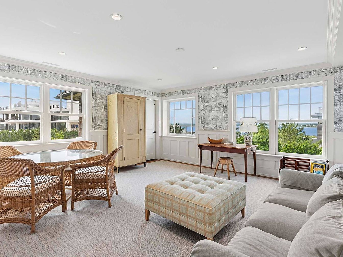 A bright sunroom expertly blends relaxation and functionality with ample natural light streaming through numerous multi-pane windows, offering scenic views of the water and lush greenery. Wicker chairs surrounding a round glass table invite family gatherings or game nights, while a cozy and generously cushioned ottoman centers a soft-toned sofa for lounging. The room’s neutral palette is accented by patterned wallpaper and crisp wainscoting, imparting a breezy coastal vibe. Thoughtful touches like a classic wooden desk, a vintage cabinet, and accessible reading baskets cater to both adults and children, making this space perfect for family connection or quiet time.