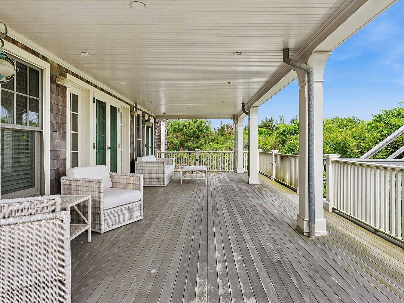 This porch offers ample space for family gatherings or relaxing afternoons, framed by classic white columns and a traditional railing. Comfortable wicker seating with plush cushions is arranged to invite conversation or quiet moments with a book. The wooden flooring and beadboard ceiling evoke a timeless, coastal charm, while large windows and multiple French doors provide seamless indoor-outdoor flow. Soft neutral tones complement the lush greenery surrounding the porch, enhancing its tranquil atmosphere. The open layout is ideal for children to play safely under watchful eyes, making it a perfect spot for all ages to enjoy together.
