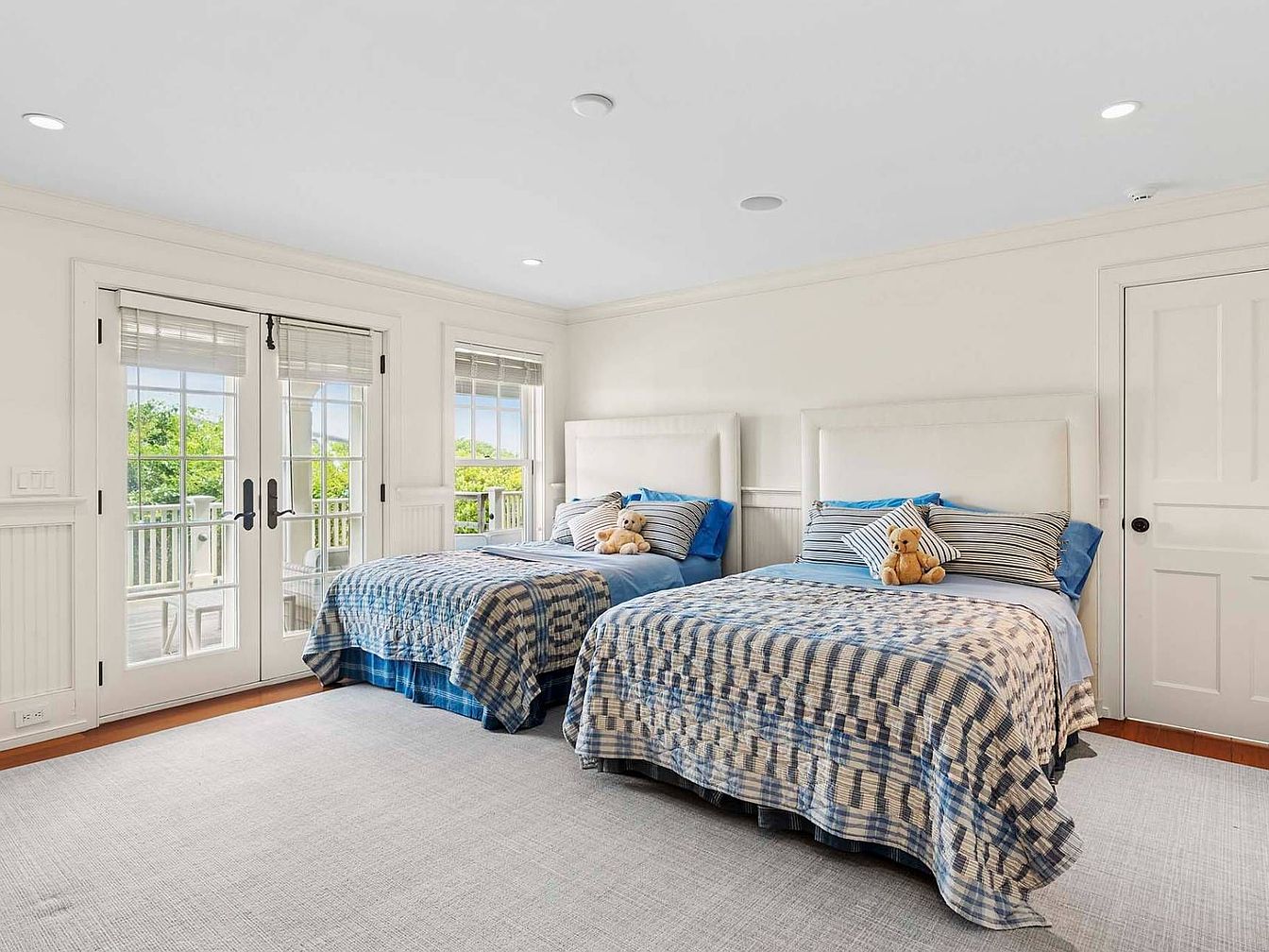 A bright and inviting kids’ bedroom featuring two full-size beds with plush upholstered headboards, topped with cozy blue and white patchwork quilts. Soft-striped pillows and adorable teddy bears add a playful, family-friendly touch. The room is awash in natural light from a set of French doors and adjoining windows that open onto a private balcony with garden views, offering an inviting space for relaxation or play. Neutral walls and a pale gray area rug enhance the sense of spaciousness, while crisp white trim and paneling provide classic architectural detail. This layout encourages both comfort and togetherness for children.