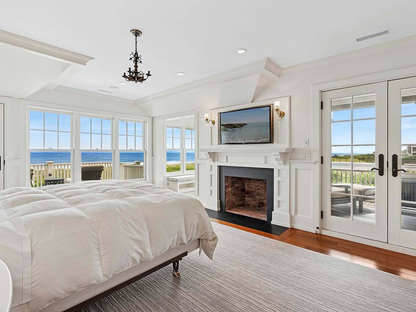 This master bedroom combines classic elegance with a relaxed coastal charm, featuring large windows and French doors that bathe the room in natural light and offer stunning ocean views. The fireplace serves as a central focal point, topped with a flat-screen TV, while crisp white walls and detailed moldings add a touch of sophistication. A plush, inviting bed promises comfort, making this space perfect for winding down with family. Hardwood flooring, complemented by a soft area rug, adds warmth, while the spacious layout provides easy access to an outdoor deck ideal for relaxing or enjoying time together.