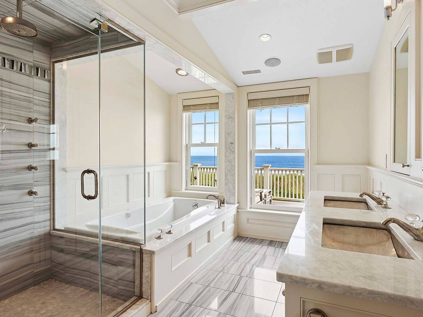 A light-filled master bathroom designed to maximize both relaxation and functionality. Floor-to-ceiling windows provide breathtaking ocean views, enhancing the spa-like ambiance. The space features a luxurious soaking tub surrounded by detailed white paneling, set beside a glass-enclosed walk-in shower accented with elegant gray veined tiles and multiple showerheads. Dual vanities with marble countertops offer ample space for family needs, while soft cream walls and polished metal fixtures create a calm, inviting atmosphere. Large mirrors and abundant natural light make the room feel spacious, perfect for busy mornings and peaceful evenings alike.