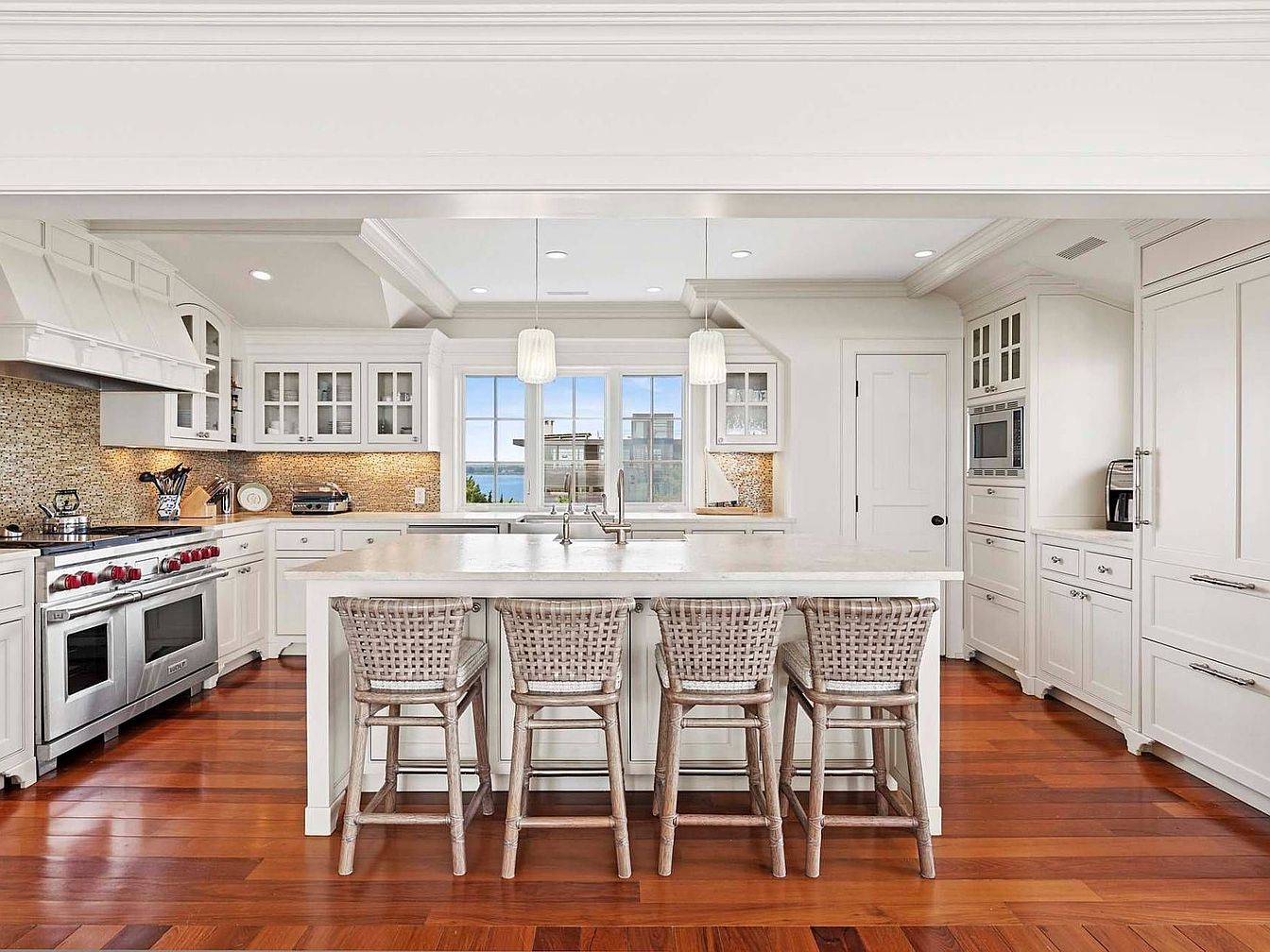 A spacious, bright kitchen with an inviting island sits at the heart of this home, perfect for family gatherings and casual meals. The pristine white cabinetry and mosaic tile backsplash create a fresh and elegant look, complemented by warm wooden floors that add a touch of coziness. Four woven barstools offer comfortable seating at the marble-topped island, making it ideal for kids or guests. Stainless steel appliances, glass-front cabinets, and ample counter space provide both style and functionality, while large windows flood the space with natural light and offer a scenic view, enhancing the family-friendly atmosphere.
