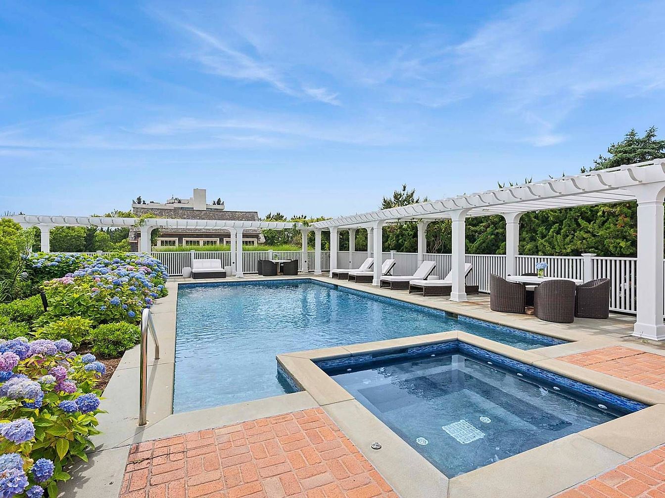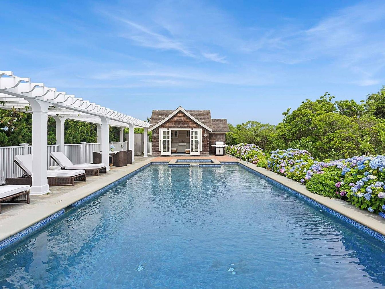 A serene and inviting backyard pool area features a long rectangular swimming pool framed by elegant white pergolas on one side, providing shaded lounge seating perfect for relaxation and family gatherings. Cozy wicker chaise lounges with plush cushions line the stone patio, creating a resort-style ambiance. The opposite side is bordered by a lush garden of blooming hydrangeas in blue, purple, and pink hues, adding vibrant color and privacy. At the far end, a charming pool house with classic shingled siding and open French doors offers additional space for entertaining or unwinding, perfectly suited for memorable summertime moments with family and friends.