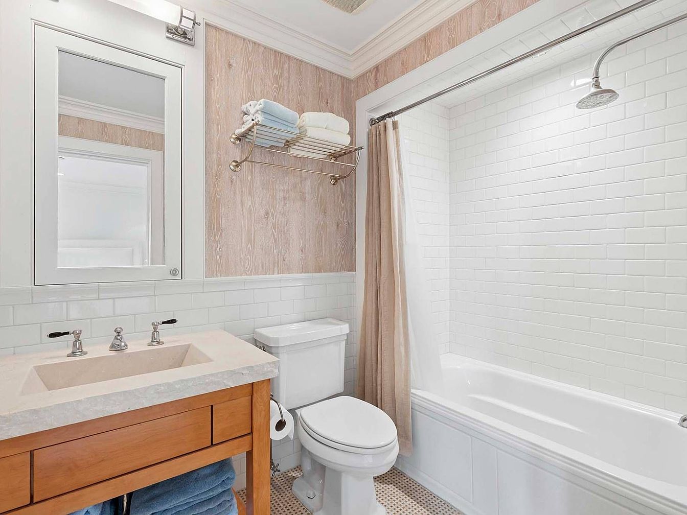 This bathroom features a clean and inviting design, perfect for families. The space is anchored by a white subway tile bath and shower combination, complemented by a soft beige shower curtain for privacy. Warm light wood paneling on the upper walls adds a touch of modern rustic charm, contrasting the crisp white lower tiles. The natural wood vanity with a stone countertop provides functional storage, while an open shelf neatly holds rolled towels, convenient for both guests and children. Chrome fixtures, a large mirrored cabinet, and thoughtful lighting enhance the brightness, creating a fresh and welcoming atmosphere ideal for everyday use.