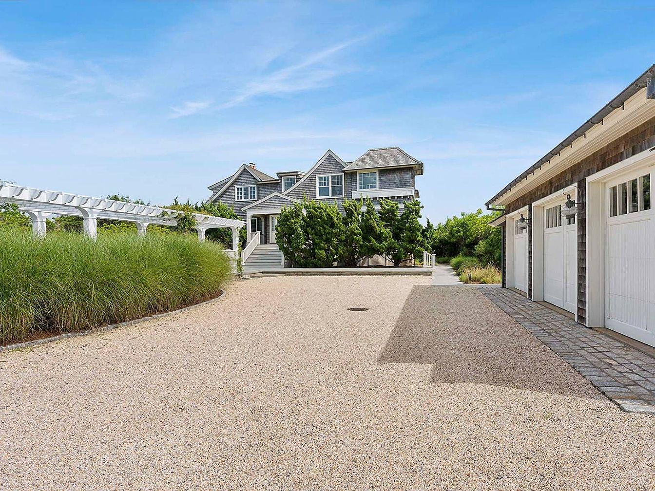 A wide, welcoming gravel driveway leads up to a charming American home, perfect for families seeking both style and comfort. The house features classic shingle siding, high gabled roofs, and white-trimmed windows, exuding coastal elegance. On one side, a detached three-car garage with carriage-style doors ensures ample parking for family and guests. Lush landscaping, including tall ornamental grasses and manicured shrubs, lines a white pergola walkway that adds character and privacy. Soft grey and white tones create a balanced, inviting atmosphere, setting the tone for a peaceful, family-friendly retreat surrounded by greenery and open skies.