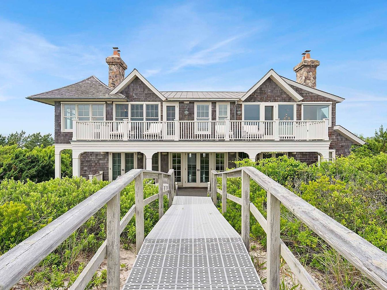 Showcasing a classic American beach house, this charming home features cedar shingle siding and white trim with two prominent stone chimneys, creating a warm and inviting facade. The upper-level balcony is perfect for relaxing and enjoying ocean views, while the lower covered patio offers shaded outdoor living ideal for family gatherings. The surrounding lush greenery ensures privacy, and a beach boardwalk leads directly from the house, adding to the vacation-ready appeal. Large windows and glass doors maximize natural light, contributing to an airy and welcoming atmosphere suited for both entertaining guests and family life.