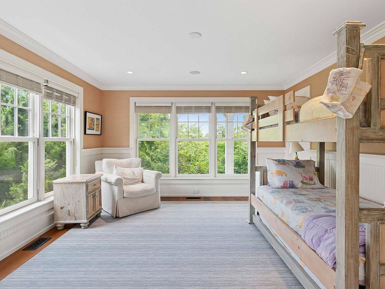 A spacious and sun-filled children’s bedroom features rustic wooden bunk beds with playful, colorful bedding, making it ideal for siblings or sleepovers. Large windows stretch across one wall, inviting natural light and soothing views of the greenery outside. The soft tan walls blend harmoniously with crisp white trim, creating a warm yet airy atmosphere. An oversized, cushioned armchair nestles in the corner for reading or quiet moments, next to a distressed wood bedside table. The room is anchored by a pale blue area rug offering plenty of floor space for play, ensuring comfort and practicality for a growing family.