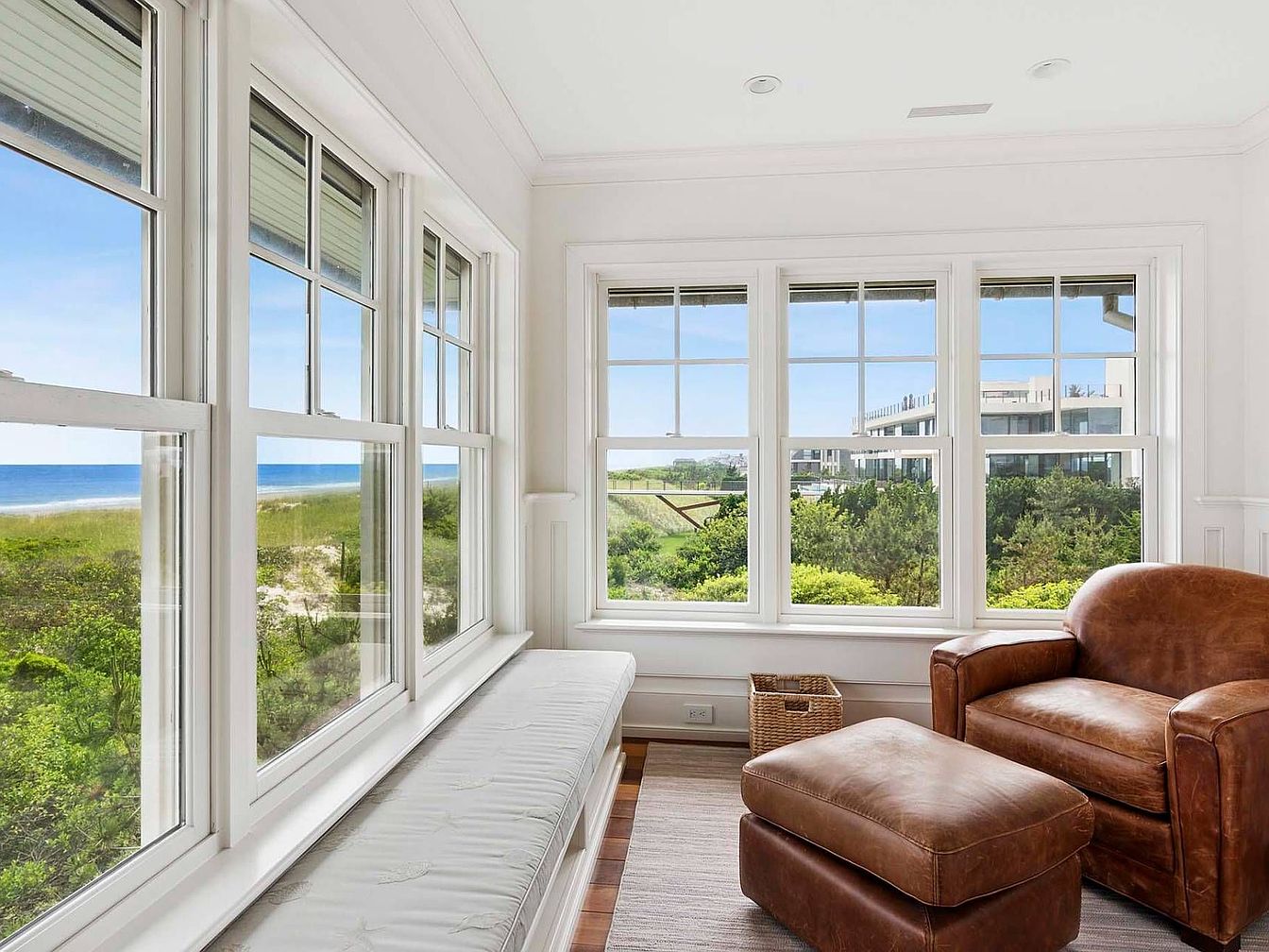An inviting nook with panoramic ocean and garden views, this cozy retreat features expansive windows that flood the space with natural light. The walls and trim are painted a fresh, bright white, creating an airy feel, while a cushioned window bench stretches beside the windows—perfect for family members to read or relax together. Warmth is added by a plush brown leather armchair paired with a matching ottoman, offering both comfort and timeless style. A soft area rug defines the space, and a woven storage basket adds a touch of practicality. This spot is ideal for unwinding and enjoying the scenery year-round.
