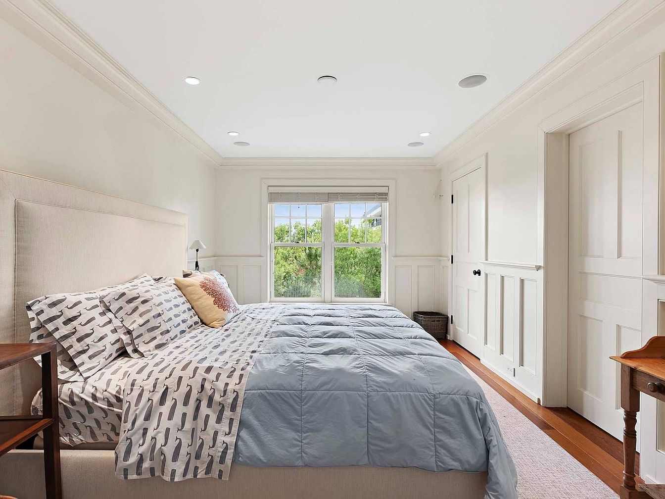 A serene and spacious bedroom features a generously sized bed adorned with cheerful, patterned linens and plush pillows, perfect for family members or guests. Sunlight streams in from a large, double-hung window, highlighting the crisp white walls, classic moldings, and traditional wainscoting that evoke timeless American home design. Warm hardwood floors contrast gently with the light palette, while simple wooden nightstands and a small desk provide practical surfaces without cluttering the space. The room’s layout is open and uncluttered, ensuring easy movement and a family-friendly atmosphere ideal for relaxation or play. Neutral colors maintain a calming, inviting ambiance.