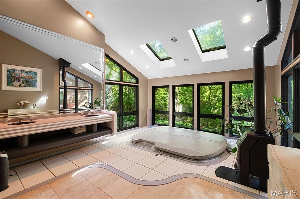 A tranquil spa retreat exudes sophistication with its spacious layout and tasteful design elements. Natural light floods the area thanks to large skylights and expansive windows, offering stunning views of the surrounding greenery. The neutral color palette of soft browns and whites creates a calming atmosphere. A sleek, marble-like soaking tub takes center stage, inviting relaxation. Complementary wood cabinetry and a unique, modern sink enhance functionality while maintaining aesthetic appeal. Cozy seating options, along with purposeful plants, bring nature indoors, making it an ideal family-friendly space for unwinding and enjoying quality time together in comfort and style.