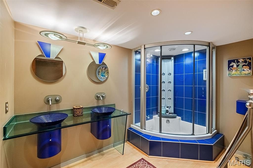 This contemporary bathroom showcases a striking blend of modern aesthetics and functional design. Featuring dual blue accent bowls atop a sleek glass vanity, it effortlessly merges style and utility. The walls are a warm beige, contrasting beautifully with the vibrant blue tiles that envelop the luxurious shower space. Unique circular mirrors add a whimsical touch, complemented by stylish lighting fixtures that illuminate the area gracefully. With ample space for family use, the layout ensures comfort and convenience, highlighted by the innovative curved shower with multiple jets. Ideal for rejuvenation, this bathroom balances sophistication and practicality for everyday living.