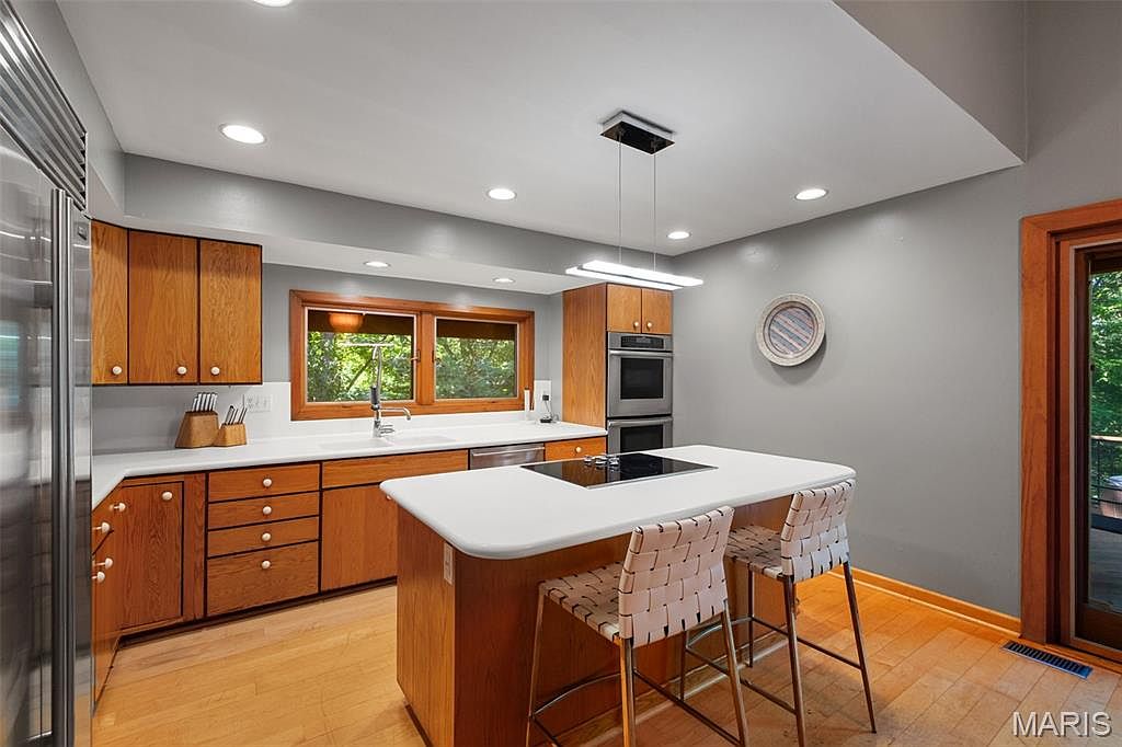 The kitchen features a harmonious blend of warm wood cabinetry and sleek white countertops, creating a welcoming atmosphere. An island with contemporary seating invites family gatherings, while large windows frame picturesque greenery, enhancing natural light. The stainless steel appliances offer a modern touch, complementing the warm tones of the oak cabinetry. Recessed lighting and a stylish pendant lamp above the island provide ample illumination. Thoughtfully designed for functionality, the layout includes convenient storage solutions and a cozy ambiance, making it perfect for culinary adventures and socializing. This space reflects a perfect balance of practicality and aesthetic appeal.