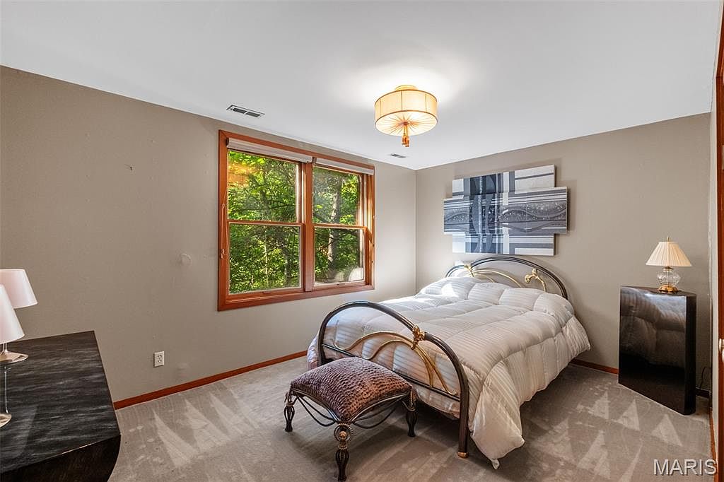 This cozy master bedroom features a warm, inviting layout with a comfortable queen-sized bed adorned in soft linens. The room showcases large double windows that fill the space with natural light, framing lush outdoor greenery. A unique modern artwork piece adds a touch of sophistication against the subtle beige walls. Elegant furniture pieces, including a sleek black nightstand and a plush, patterned ottoman, complement the room’s aesthetic. The soft carpeting underfoot enhances comfort, making it a perfect family-friendly retreat. Ceiling lighting fixtures provide a gentle glow, creating a serene and restful ambiance suitable for relaxation.