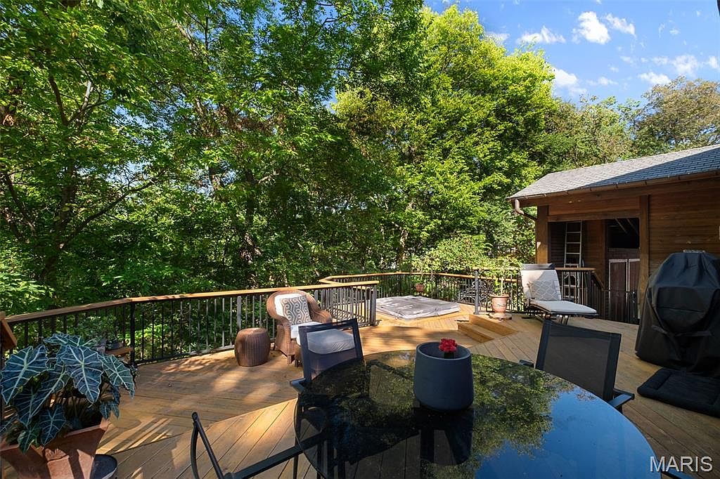 The outdoor deck blends seamlessly with nature, featuring a spacious layout that invites relaxation and family gatherings. Sunlight floods the area, enhanced by the surrounding lush greenery providing a tranquil backdrop. Modern yet comfortable furniture includes a stylish dining table, cozy lounge chairs, and a chic sunbed, perfect for enjoying warm evenings. A simple black railing frames the space while wooden decking adds warmth and charm. Potted plants introduce a hint of color, and the view of the dense trees creates a serene atmosphere, making it an ideal sanctuary for entertaining or unwinding in solitude.
