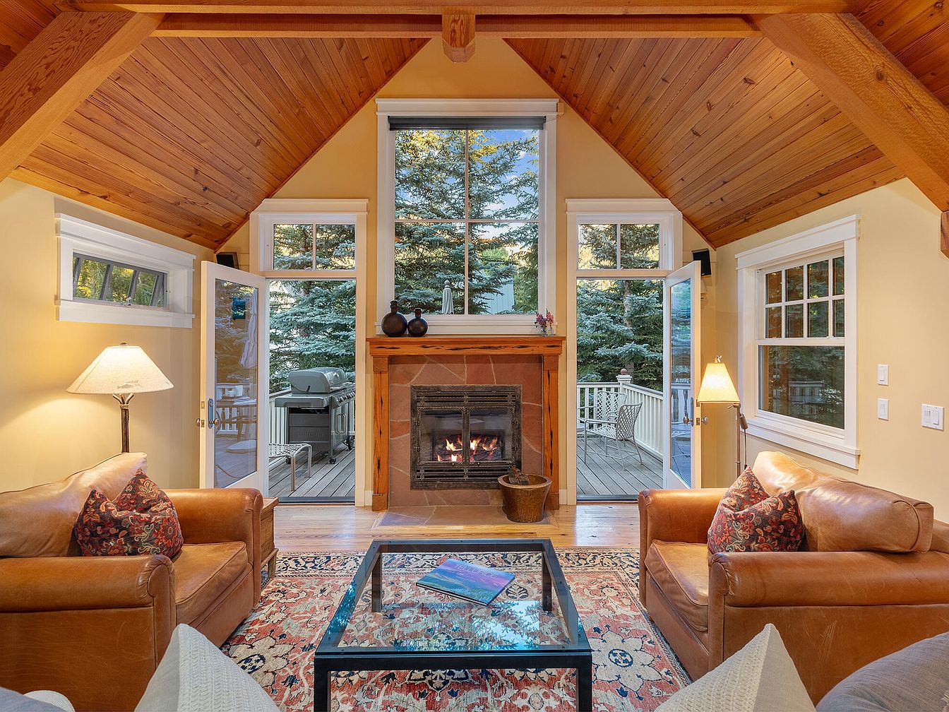 A warm, inviting living room boasts rich wooden vaulted ceilings and exposed beams, exuding rustic charm and timeless comfort. The centerpiece is a stone fireplace flanked by tall windows and French doors, seamlessly connecting the indoors with a forested outdoor deck. Two plush, caramel leather armchairs with patterned pillows face a glass coffee table set atop a vibrant area rug, providing a welcoming space for family gatherings or quiet reading. Soft, golden-hued walls enhance the cozy atmosphere, while ample natural light and thoughtfully placed lamps ensure brightness throughout the day. This space is perfect for relaxing in comfort and style.