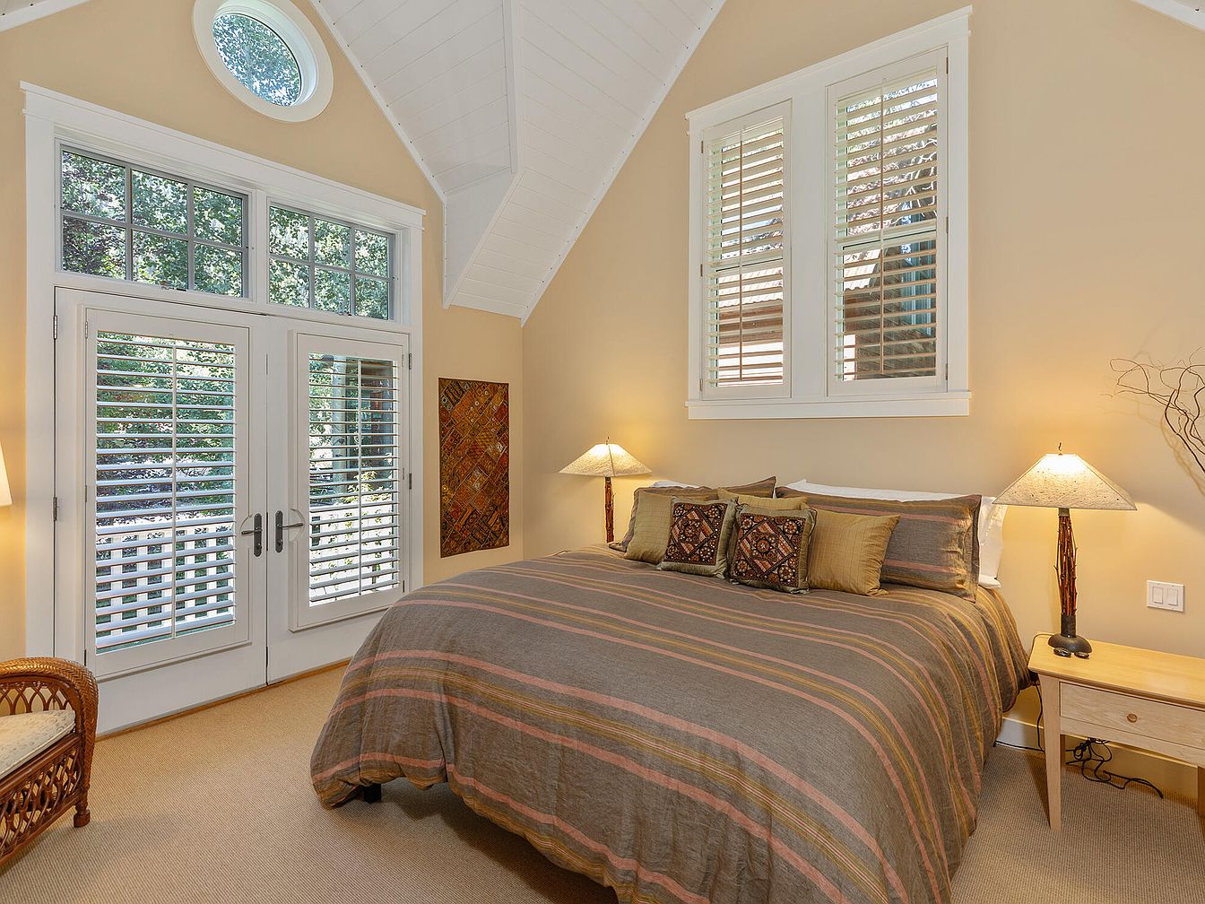 A peaceful master bedroom featuring vaulted ceilings with white shiplap and abundant natural light streaming through French doors and a large circular window. Soft beige walls create a warm and inviting atmosphere, complemented by neutral carpeting and wooden furniture. The cozy king-size bed is adorned with earthy striped linens and decorative pillows, providing comfort and style suitable for the entire family. Shuttered windows offer privacy while maintaining the room’s brightness. Subtle decor and symmetrical table lamps add a touch of elegance, while thoughtful architectural details lend a sense of spaciousness and tranquility ideal for relaxing or spending time together.