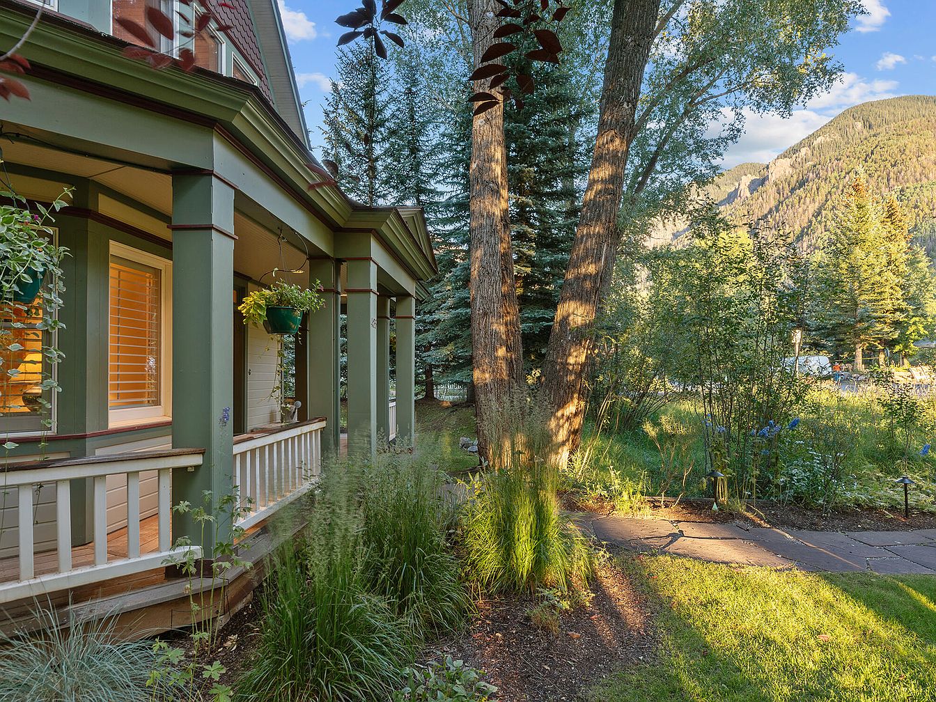 A charming front porch seamlessly blends into a lush garden, framed by sturdy green columns and classic white railings. The inviting porch features hanging planters and soft, warm lighting from generous windows, enhancing its welcoming feel. The garden path, lined with vibrant greenery and mature trees, leads toward scenic mountain views in the distance. This peaceful outdoor space offers ample room for kids to explore and families to relax. Its earthy color palette of greens, browns, and whites creates a harmonious look, while the craftsman-inspired architectural details add timeless appeal and character to the home’s exterior.