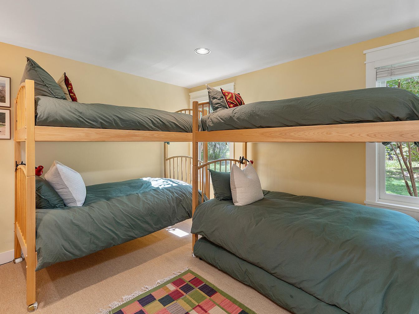 A cheerful and inviting bedroom designed for kids, featuring two sturdy sets of natural wood bunk beds laid out in an L-shape to maximize space and comfort. The walls are painted a soothing pale yellow, creating a warm atmosphere complemented by ample natural light streaming in from a large window. The bedding is coordinated in deep green tones, accented with playful pillows. A colorful checkered rug adds personality to the neutral carpeted floor, ensuring a cozy and safe environment for play. The thoughtful layout encourages group sleepovers and family bonding while maintaining an organized and functional aesthetic.