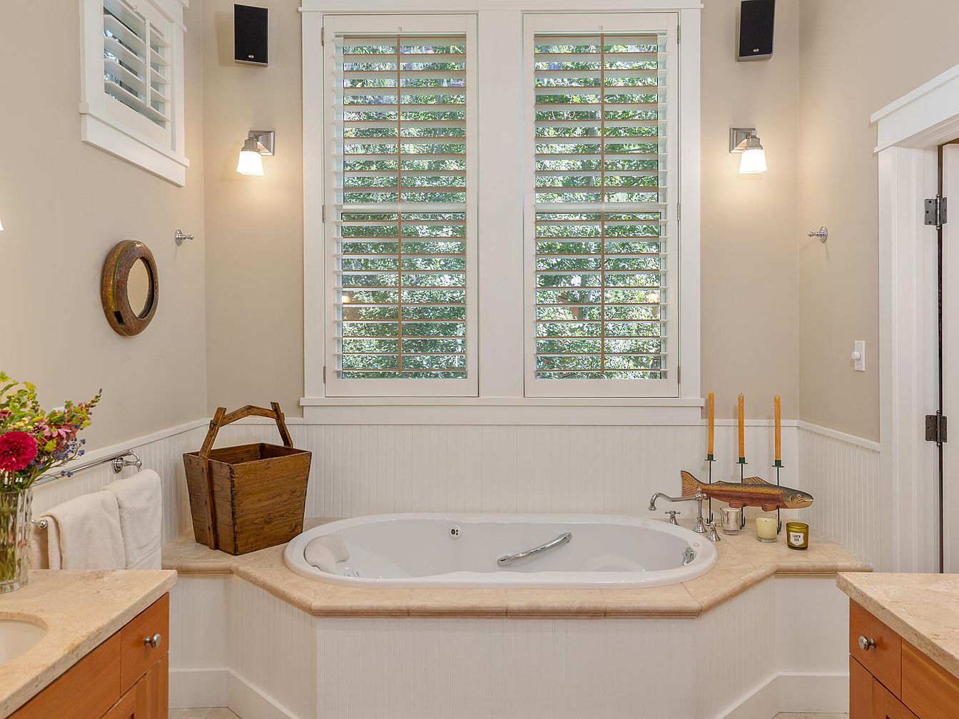 A serene bathroom nook features a spacious built-in soaking tub framed by creamy marble ledges, perfect for family bath time or a relaxing retreat. Shuttered windows fill the space with natural light while maintaining privacy, highlighting the classic wainscoting and warm beige walls. Ample countertop space and dual vanities make busy mornings effortless. Accents like a wooden basket, whimsical fish-shaped candleholder, and fresh flowers lend charm and warmth to the room. Soft towel storage and wall-mounted lighting ensure both functionality and comfort, while the overall neutral palette creates a calming, family-friendly haven for unwinding after a long day.
