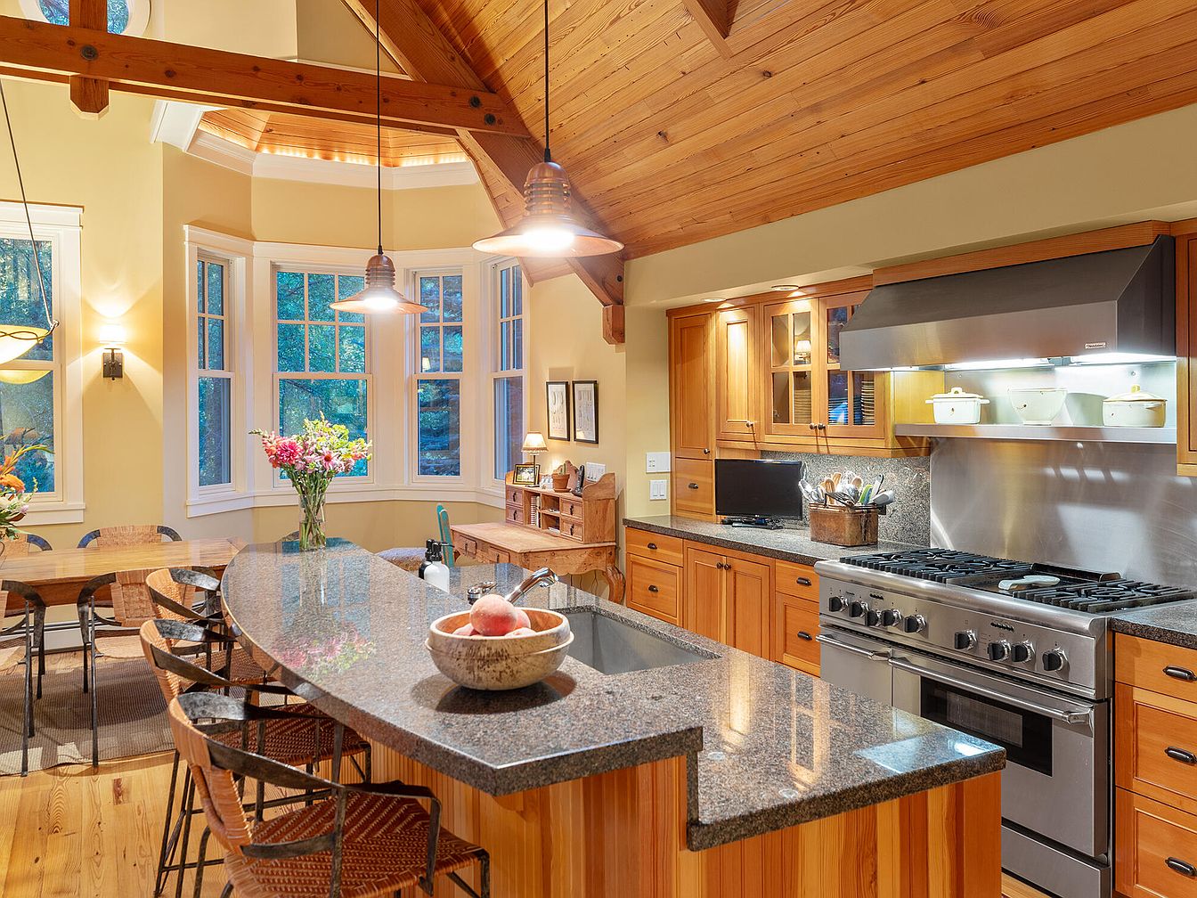 Warmth radiates from the open-concept kitchen, featuring a vaulted wood ceiling and exposed beams that create an inviting rustic charm. The centerpiece is a spacious granite-topped island with ample bar seating, ideal for gathering family and friends during meal prep or homework sessions. Rich natural wood cabinetry provides plenty of storage and houses modern stainless steel appliances, including a professional-grade range. A cozy breakfast nook is framed by large bay windows that flood the area with natural light. The neutral color palette, complemented by fresh flowers and soft lighting, encourages togetherness in this functional and stylish family hub.