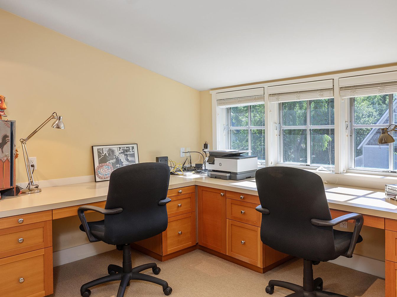 A dedicated home office area features an extended L-shaped desk setup, perfect for remote work or family study sessions. Dual ergonomic black office chairs encourage collaborative productivity, while the expansive desktop offers plenty of room for computers, paperwork, or crafts. Honey-colored wooden cabinetry beneath the desk provides generous storage to keep essentials organized and out of sight. Soft yellow walls lend warmth, and large windows bathe the space in natural light while providing a scenic view of greenery outside. Clean architectural lines, practical adjustable lamps, and subtle decorative touches create a cozy yet highly functional work environment.