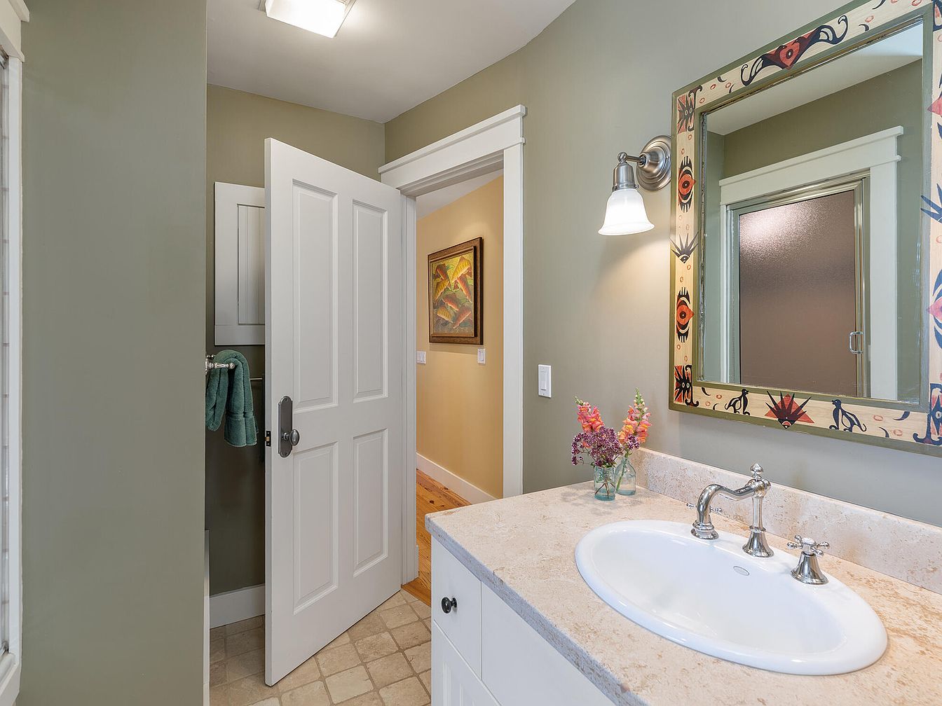 This inviting bathroom vanity area features a spacious countertop in creamy stone, paired with a crisp white under-sink cabinet. The sage green walls create a calming ambiance, enhanced by classic white trim and doors that offer a timeless architectural touch. A uniquely painted mirror frame adds colorful personality above the sink, complemented by a single, stylish sconce for ample lighting. Practical features, like a towel holder with neatly hung green towels, ensure functionality for family use. The adjacent door opens to a warm-toned hallway, seamlessly connecting this refreshed bathroom to the rest of the home.