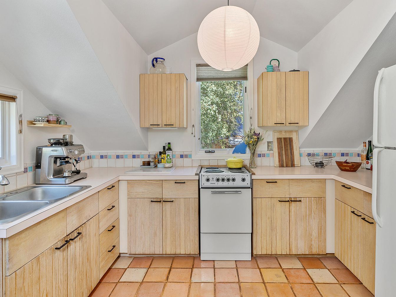 A bright, welcoming kitchen with terracotta tile flooring and soft, sandy wood cabinetry creates a comforting space ideal for families. The layout is practical, featuring ample countertop workspace, a compact stove, and a double sink beneath a small window. Pastel-tiled backsplash with cheerful pops of blue, pink, and purple adds a playful, child-friendly touch. Open shelving holds cups and small essentials, while the coffee maker and chopping boards are ready for daily routines. Natural light floods in, making this kitchen both functional and inviting, while thoughtful details keep everyday items within easy reach for hassle-free cooking and cleanup.
