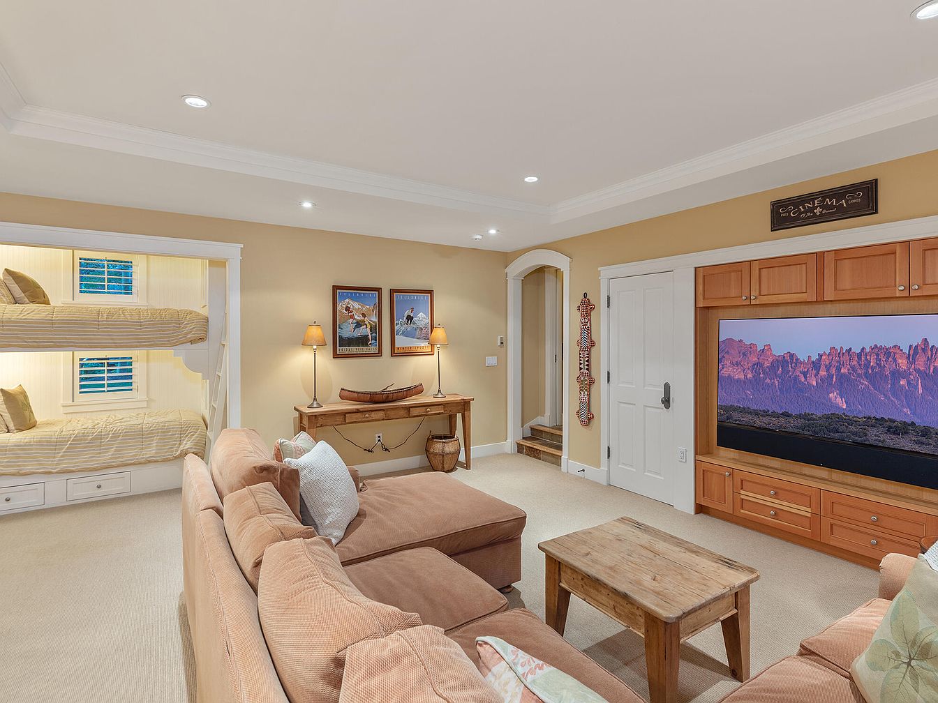 Warm neutral tones and plush seating create an inviting family-friendly space ideal for relaxation and entertainment. An oversized sectional faces a built-in entertainment center featuring a large flat-screen TV, perfect for movie nights. Custom cabinetry offers ample storage, keeping the area organized. Adjacent to the lounge, built-in bunk beds accommodate children or guests, maximizing functionality and adding playful charm to the room. The cozy lighting from side lamps and soft carpeting enhance comfort, while tasteful wall art and a rustic wooden coffee table provide character. Thoughtful details like under-bed drawers add extra practicality for active, growing families.