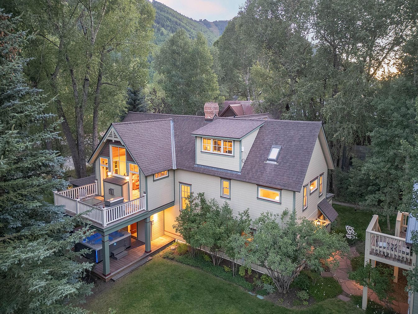 Nestled among mature trees and lush greenery, this inviting backyard deck and patio area offers a serene retreat for the whole family. The spacious upper deck is perfect for outdoor dining and lounging, bordered by a timeless white railing that enhances the classic American architectural details of the home. Down below, a sheltered patio features a hot tub and shaded seating, ideal for relaxation or entertaining guests. Soft, warm exterior lighting highlights the gentle cream and green color scheme, while pathways and landscaped garden beds encourage outdoor play and gatherings. The surrounding natural beauty creates a peaceful and private atmosphere.
