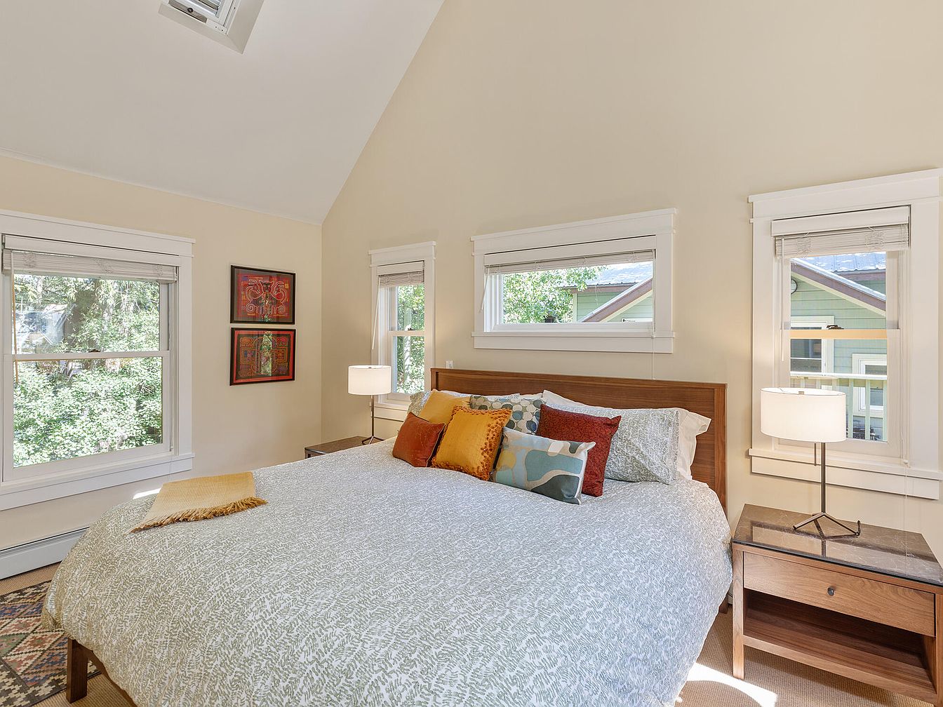 This spacious bedroom features vaulted ceilings and plenty of natural light streaming through three large windows, creating an airy and inviting atmosphere. The neutral wall color sets a tranquil tone, while the soft, patterned bedding adds subtle texture. Pops of color from decorative accent pillows inject personality and warmth. Two modern, wood nightstands with matching table lamps provide symmetry and functionality, making it ideal for couples or families. Thoughtful wall art brings character to the space, and an area rug hints at cozy comfort. The overall design encourages relaxation, combining simplicity with family-friendly practicality.