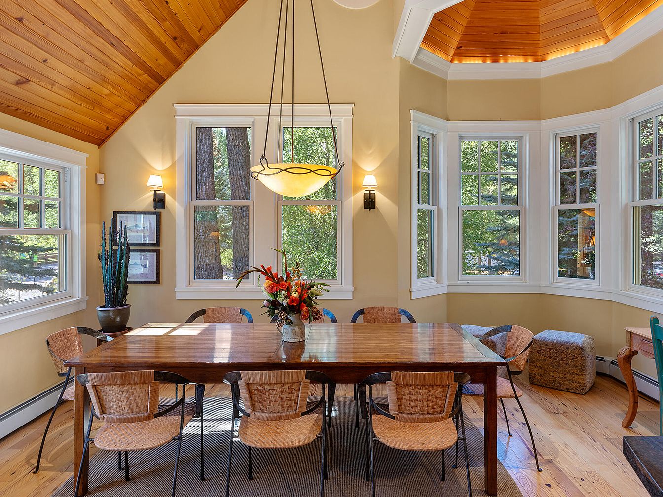 Warm, inviting dining space bathed in natural light from expansive bay windows, offering picturesque views of the surrounding greenery. The vaulted ceiling with wood panelling adds rustic charm, complemented by soft beige walls and elegant crown molding. A large wooden dining table seats eight comfortably, perfect for family meals and gatherings. The woven chairs provide both style and comfort, while decorative accents like a vibrant floral centerpiece and a potted plant add a touch of nature indoors. Cozy ottomans in the corner create a relaxed spot for children or casual seating, making this area family-friendly and welcoming.
