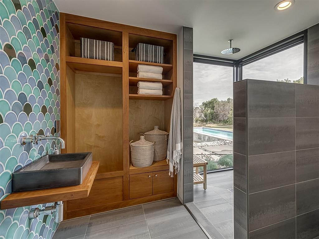 This modern bathroom combines functionality with serene aesthetics, featuring a stylishly designed open layout. The standout element is the stunning seafoam green tiled wall, invoking a calming feel. A sleek black sink, paired with a warm wooden shelf, offers an elegant contrast against the textured tiles. Ample storage is provided in custom cabinetry, neatly organizing towels and essentials, while woven baskets add a touch of natural texture. The glass shower enclosure invites natural light, enhancing the spacious ambiance. Large windows provide picturesque views of the outdoor pool, creating a seamless connection between indoor relaxation and outdoor enjoyment.