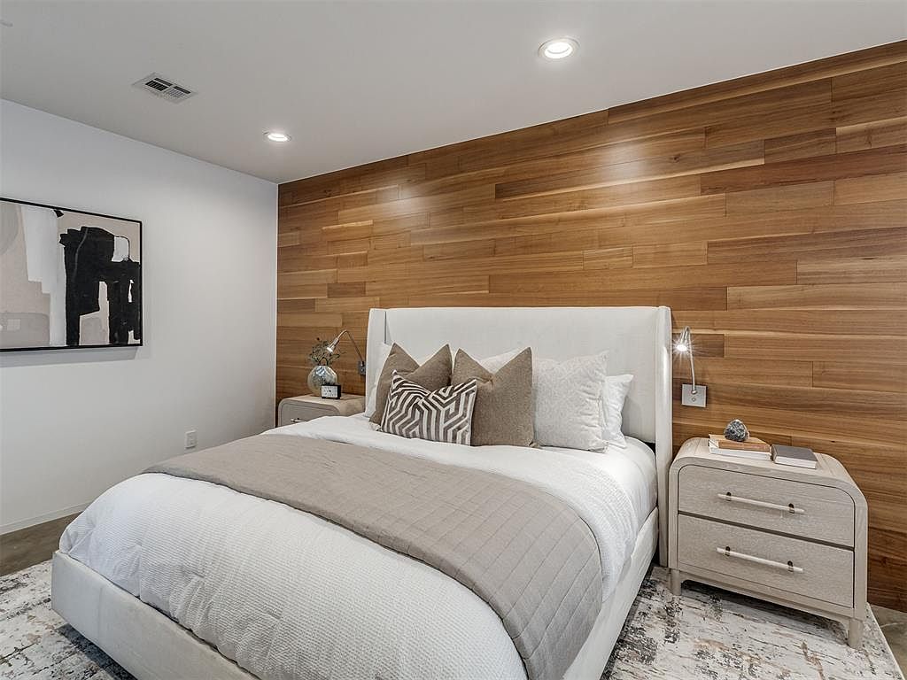 Designed for comfort and tranquility, this master bedroom features a striking accent wall crafted from warm wood panels, bringing a natural element into the space. A plush, oversized bed adorned with decorative pillows in neutral tones invites relaxation, while a cozy quilt adds texture. Nightstands flanking the bed provide both function and style, enhanced by stylish lamps that offer soft lighting for evening reading. The color palette, a harmonious blend of whites and browns, creates a soothing atmosphere. Thoughtful architectural details, such as recessed lighting and a textured rug, complete this inviting, family-friendly retreat.